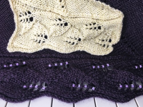 Just Enough Lace is an asymmetric triangle knit on the bias from point to wide end. It features a leafy edging along one edge, and a stockinette body with occasional bands of eyelet lace. The leafy edging is a perfect place to add beads for sparkle and drape.