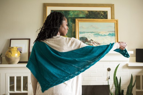 This is my Just Enough Lace shawl. I designed it for the Knit Picks Delicate Details Collection two years ago, and now it’s available on Ravelry, too.