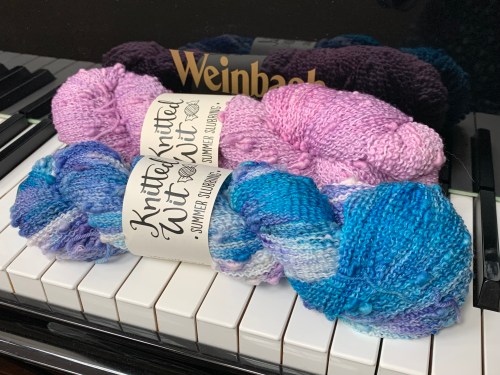 The slubby texture of Knitted Wit’s Summer Slubbing fingering weight yarn shines with simple stitch patterns in this triangular shawlette, knit on the bias. Alternating waves of nubbly stockinette and lacy eyelet bubbles make this chic piece perfect for warding off summer’s air-conditioned chill.