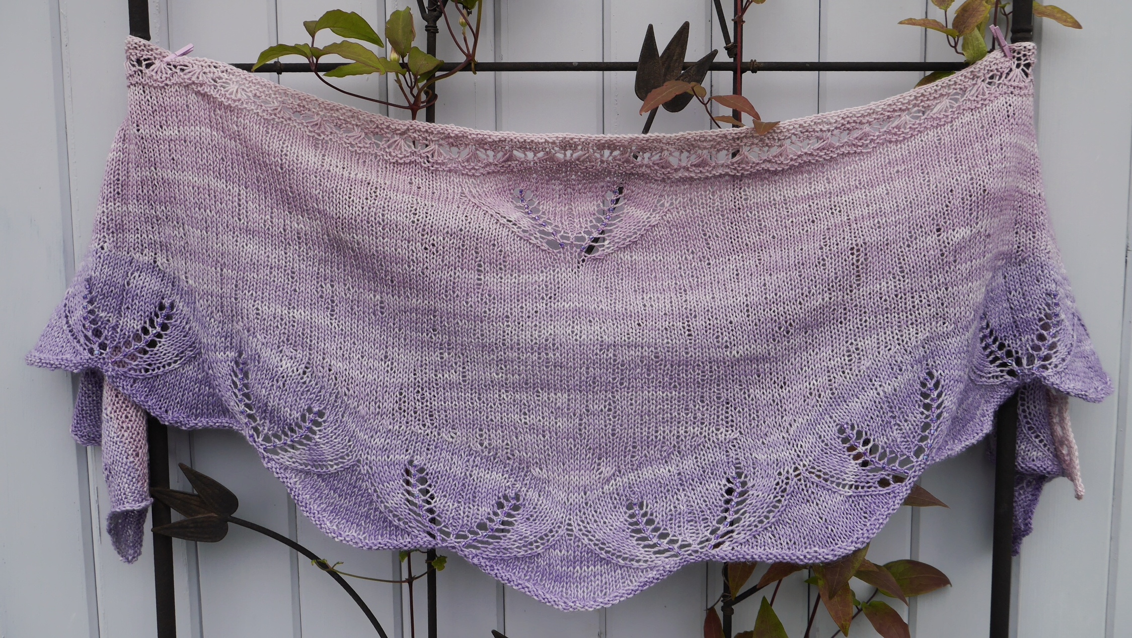 are echoed at the top of the shawl. A ribbon of shell lace is set off by a garter stitch frame.