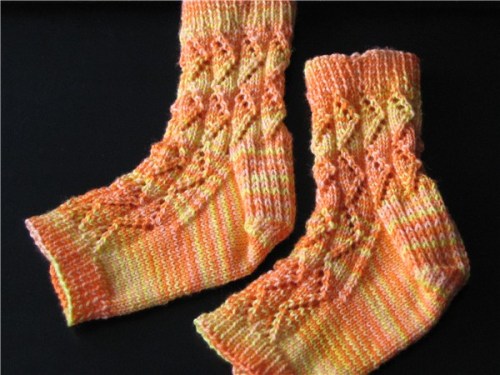 ZigZag Lace Pedicure Socks: This pattern uses one hank of Yarntini Variegated Sport to make a medium/large sized sock, 7 3/4 inches in circumference around foot. Gauge is 7 st and 10 rows per inch in stockinette stitch. Yarntini is a yummy heavy sport weight, almost DK. To achieve a smaller size, decrease more stitches at the gusset (see note in gusset instructions).