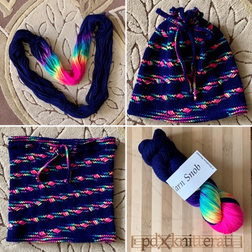 Pooling is a Cinch is a convertible piece that will please both hat and cowl lovers. The stockinette stitch body is a perfect canvas for playing with assigned pooling. Worsted weight yarn knits up quickly for a fun introduction to this technique. Choose a yarn that is meant to pool; you’ll want 6 to 8 inch (15-20 cm) runs of your pooling color.