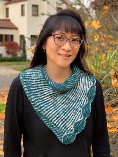 The Aspen Leaf Brioche Cowl is knit with two skeins of fingering weight yarn in contrasting colors. I used Manos del Uruguay Alegria in Mojito and Lush. The cowl is knit from the bottom edge up, and seamed at the neck. Gauge is not critical, but it can affect size and yardage requirements. This pattern features flat syncopated brioche with brioche increases and decreases, and a syncopated border around the leaf motif.