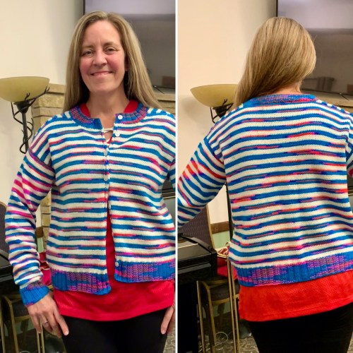 Linn brought her cardigan to show me what she did with Yarn Snob Keith’s Cabana Boy pooling colorway. I love how the white stripes lightened things up; you can see on the bottom band that the colors are pretty intense! And look how the hot pink pooled on one sleeve, and the orange pooled on the back of the other. You could never get it to do that if you were planning it.