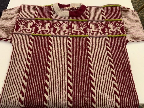 Sheryl’s show and tell sweater was a fantastic example of yarn color dominance. Those stripes aren’t ribbing; they’re 1×1 stockinette stripes.