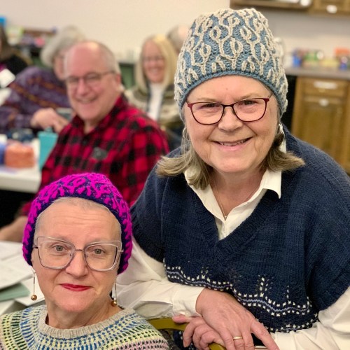 Look at all the smiling brioche knitters! We worked on Brioche Pastiche, my choose your own adventure pattern for hat or cowl, plain or embellished. (I’m teaching this class again at Hook and Needle on Saturday; if you’re local and want to learn to knit brioche, please sign up!) We also worked on Whale Conga Line, as an introduction to brioche knit flat and syncopated brioche. That’s a lot of brioche!