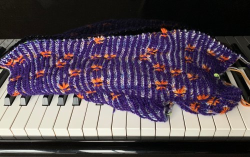 I love this color pooling yarn from Yarn Snob/Knits All Done; the green/purple is Bellina, which is named for an orchid. I wanted to make it sing! Bisquee thinks it looks good, too. Do you see peacock feathers? Flames?