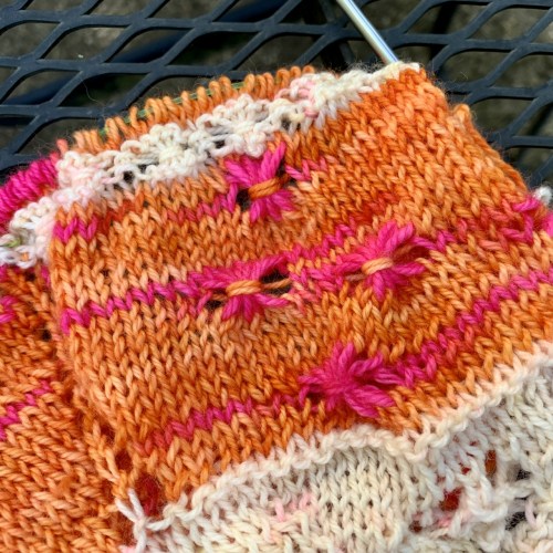 My first attempt told me that the pink flowers were lost on a stockinette stitch background. I could also see that my floral stripe was too bold, and stole the show from the assigned pooling.