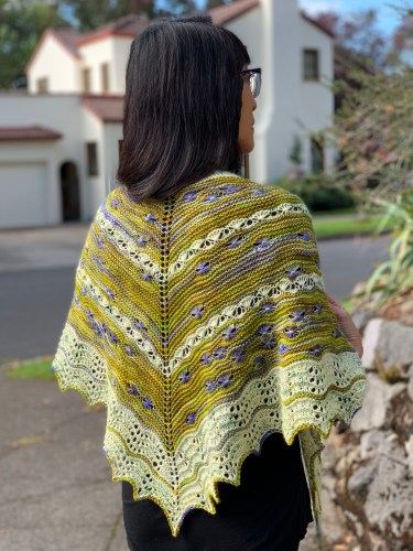 This gorgeous shawl has been in the works since last spring! I wanted it to be absolutely perfect, and let the yarn tell me what it should be. The first idea was a whisper, and I refined it several times until it sang out. The shawl features flowers and assigned pooling stars (or are they flowers, too?) on a garter stitch background. I love that it has more than just assigned pooling; lace adds a harmonious counterpoint. And it’s an answer to several knitters who wanted a shawl instead of a cowl.