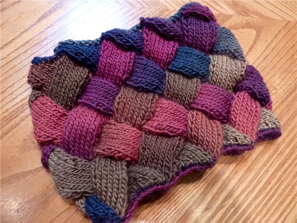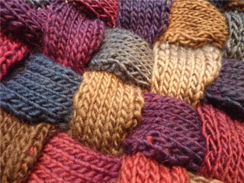 I’m teaching my Athena Entrelac Cowl at Madrona Fiber Arts Festival in February. I love entrelac; it makes a knitter feel ever so clever! It’s even easier when you have a slow color changing yarn to make the color choices for you. And the work just kind of pulls you along; you want to knit just one more square, and then another, and another.