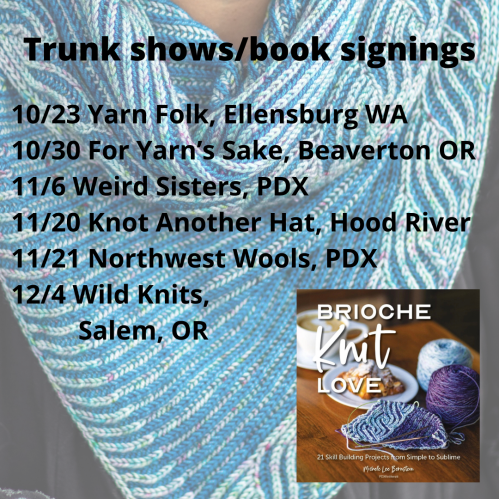 I’m having a little book tour to celebrate Brioche Knit Love. Come see the samples from the book, and I’ll sign your book, too! You can pre-order your book from these shops.