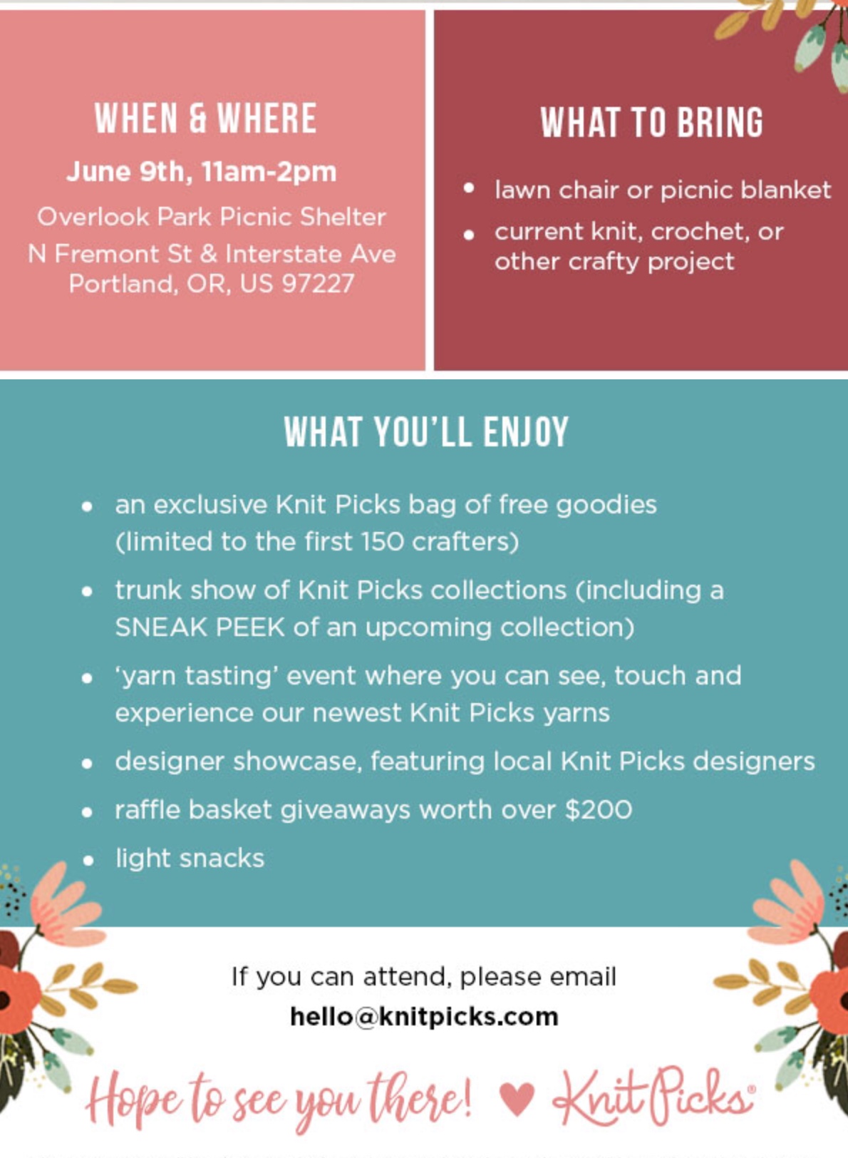I’ve spent the past couple WWKIPDays with Knit Picks at their Knit Pick-nics. I’ll be doing the same this year, with a little trunk show again.