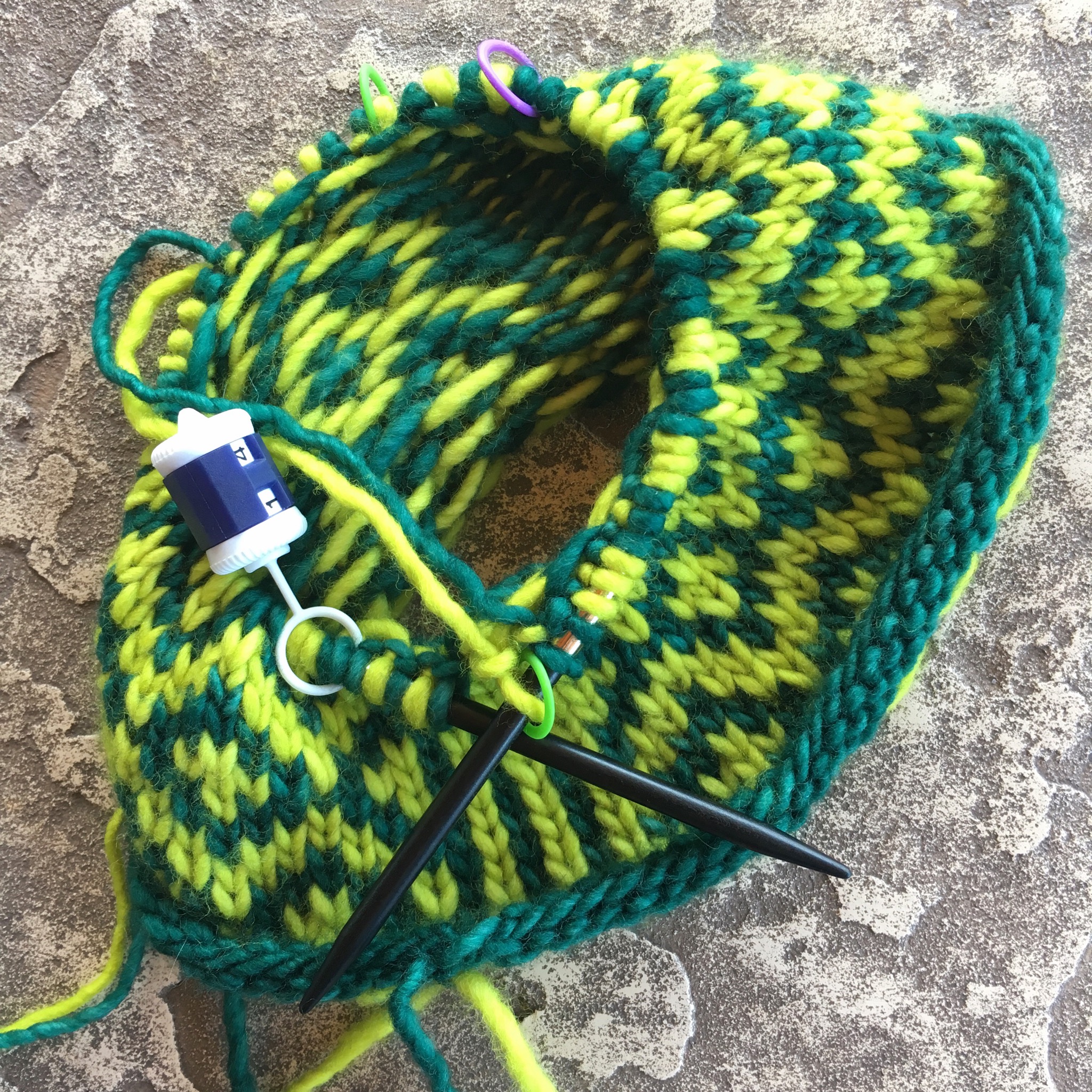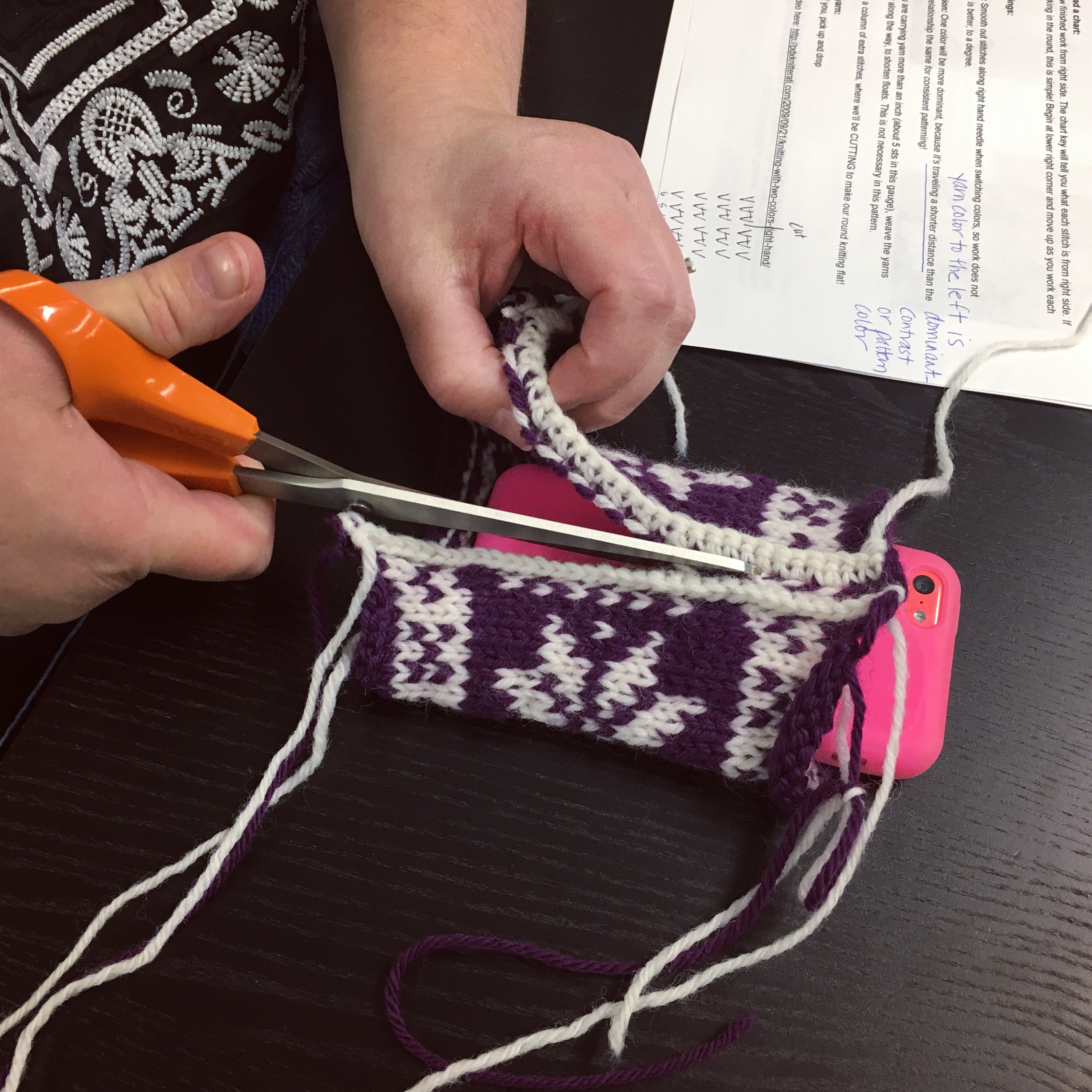 Now I’m going to offer the class at Twisted as a single class, the one with the cutting fun. I’m updating the pattern with a few more helpful hints for stranded colorwork, and changing the steek area from a checkerboard pattern to vertical stripes. This will make it easier to see exactly where to reinforce the knitting before cutting the steek.