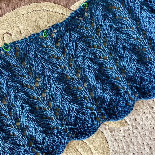 I’ve gone through two design ideas so far. One would require an extra skein of speckled yarn, so no go on that one. It’s risky to order another and expect that the speckles will be the same (ask me how I know). Both this idea and the next idea involve working from the large end to the small end, in order to make the motif right side up. It’s a lot more planning and math, but it will be worth it. I hope. Onward!