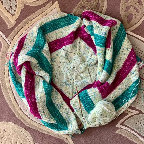 I’m coming to the end of this glorious garter stitch knit. so relaxing, so soothing, so great for multi-tasking! It’s a variation on a theme, a re-imagining of my Cherry Blossom Wrapture from last spring. This one is a little more straightforward (fewer choices to make before knitting). I love these colors; I’m so glad I swapped out the pale pink for this deeper, more intense hue. I’m on the very last log, and then I have a lot of ends to sew in before blocking.