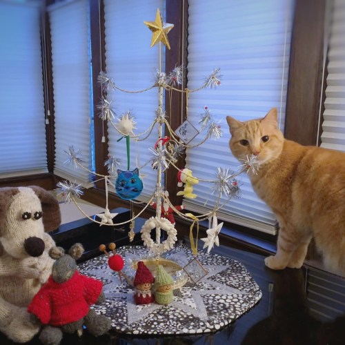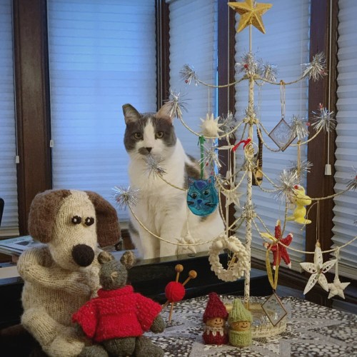 I put up my tree, on top of the piano. That surfing Santa is finally getting his legs glued back onto the surfboard this year; one of our cats knocked him off the piano years ago. I also put up the Christmas stockings on the mantel.