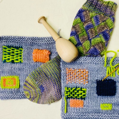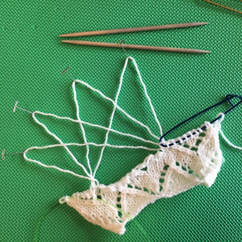 I’m knitting away on this new entrelac piece. It’s much like Minerva, my usual entrelac teaching piece, but it has fewer units in width, so it grows more quickly in length. There’s also an optional flower motif in the center squares, because why not add something new?