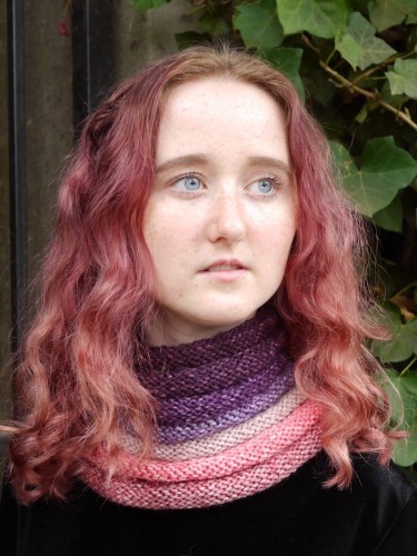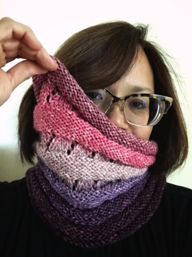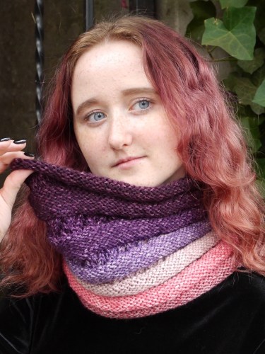 The cowl is knit in the round with 150g/277 yards of worsted weight yarn. I used a 150g cake of KnitCircus Ringmaster Panoramic Gradient in the Fig and Prosciutto colorway. The scrunchy rings capture warmth around your neck.