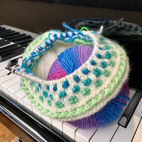 I knew I wanted a herringbone braid for the bottom edge of the hat, but I was going to have to be canny about it. I had planned to use it for the cowl, but when I was knitting the braid last year, the soft, single ply low-twist yarn wanted to drift apart in the first row of the twisty braiding process. I figured a hat had fewer stitches, so maybe it wouldn’t have enough time to drift apart.