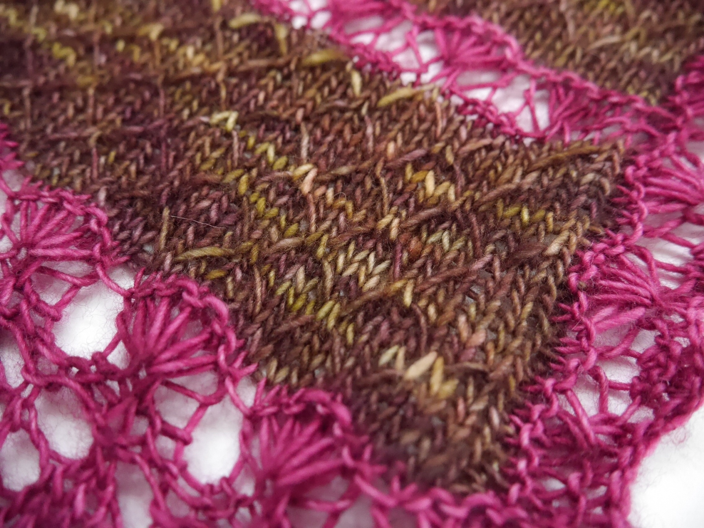 But I’m still knitting! Current project on the needles in Black Orchid and an unnamed green from Yarn Snob. I love this color combo.