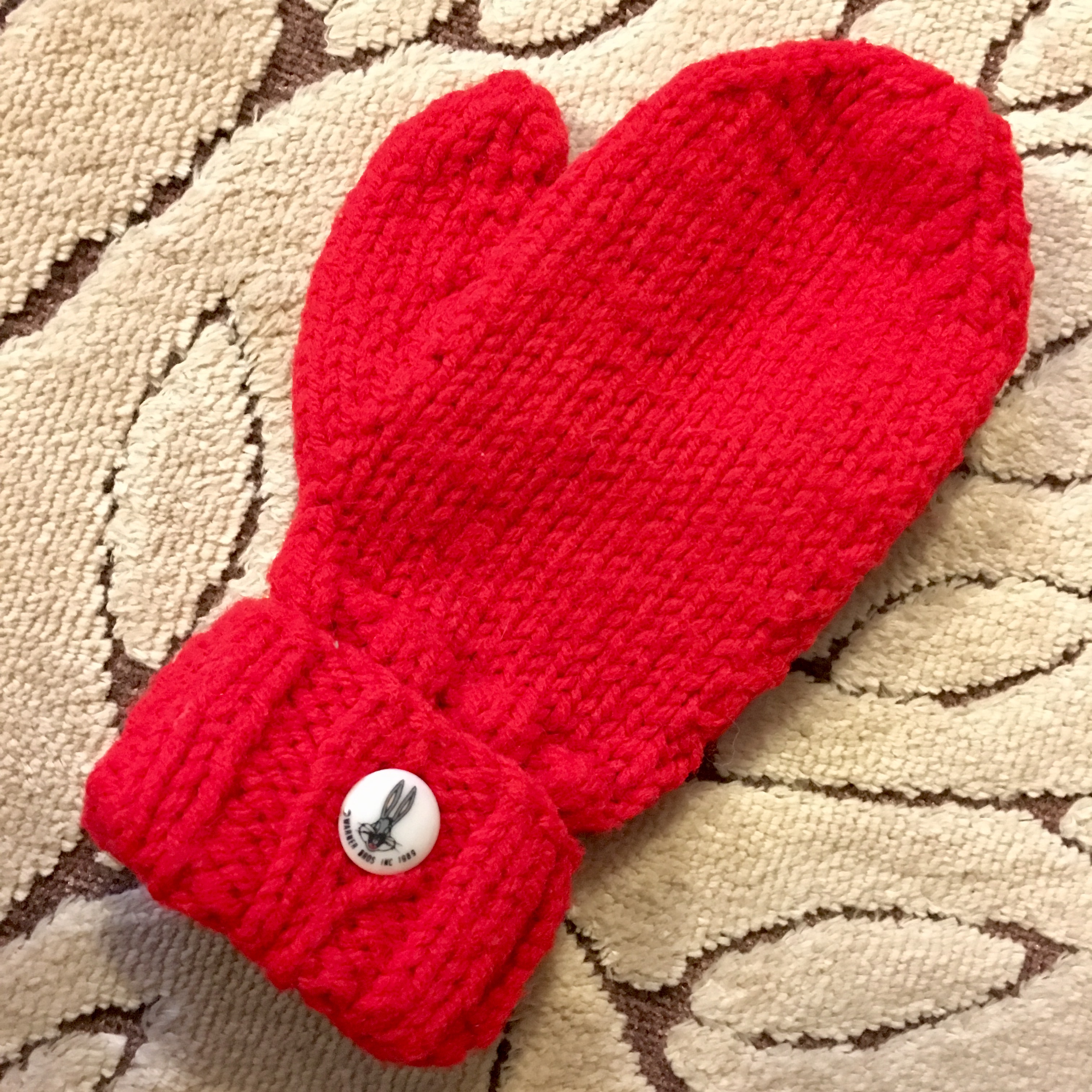 I also found this lone mitten. Once upon a time, I made 8 pairs of these, with Bugs Bunny buttons, for eldest son’s third birthday. Pretty swank party favor! I knit these flat and seamed them, because I didn’t know how to knit in the round yet.