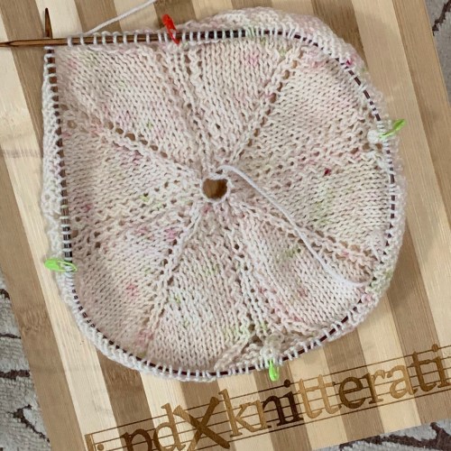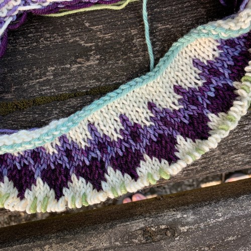 The Coffee Bean Trivia Cowl is a bandana style cowl that is knit flat from the lower point until it’s wide enough to join to knit the neckline in the round. This is a very easy to wear piece. And the yarn is sooooo soft. The working name of this was Kelpie, because I thought it looked like a kelp forest underneath the waves. I decided that the little roundels could also be tiny coffee bean trivia shells, as in this post. (Check the link for a fun free project, the Victoriana bracelet.)