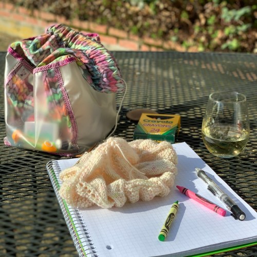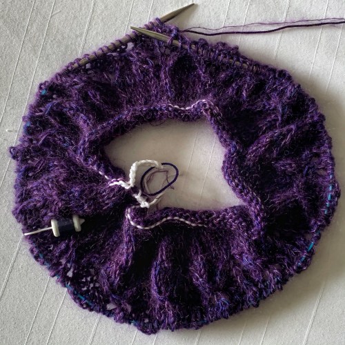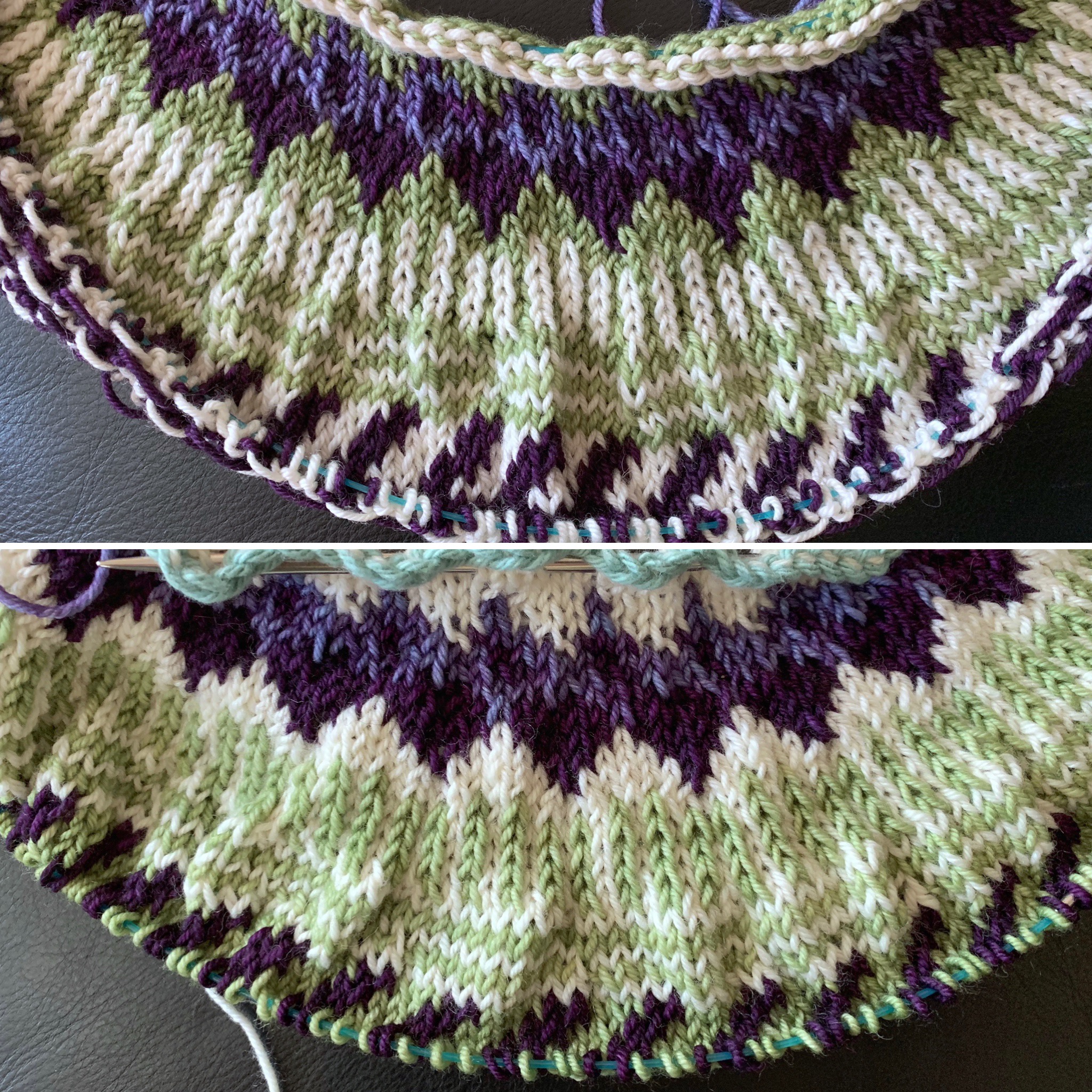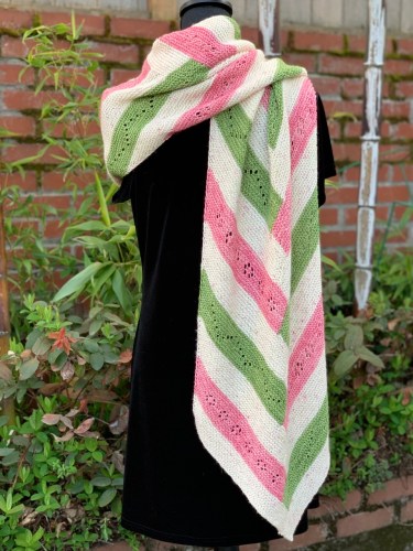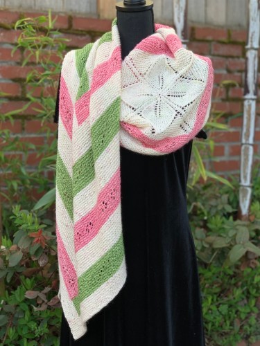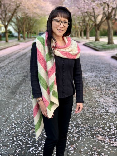 And the shawl takes two skeins of fingering weight yarn; it’s sooooo squishy. I love how it feels around my neck, especially in this yarn. (Thanks to Ann Berg for knitting this sample for me!)