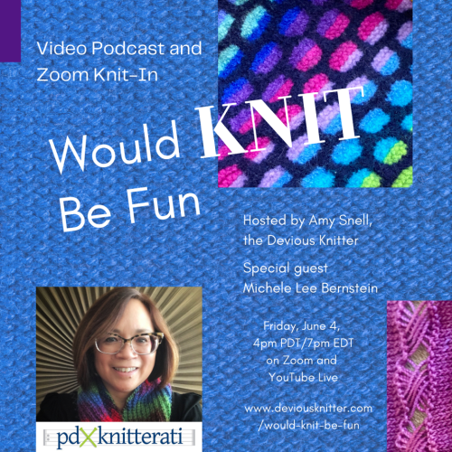 On Friday at 4 pm Pacific/7 pm Eastern, I’m chatting with Amy Snell/Devious Knitter on her podcast, Would Knit Be Fun. Amy is an excellent designer/teacher with a great knowledge base. Come join us! You can sign up at this link.