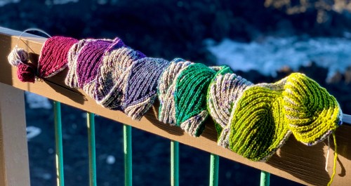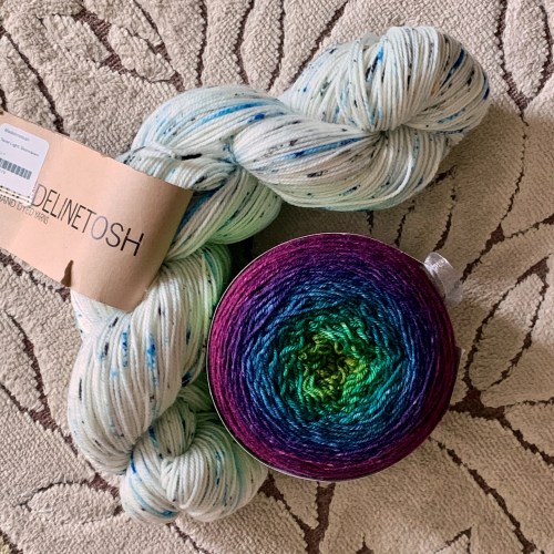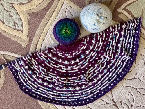 And the shawl takes two skeins of fingering weight yarn; it’s sooooo squishy. I love how it feels around my neck, especially in this yarn. (Thanks to Ann Berg for knitting this sample for me!)