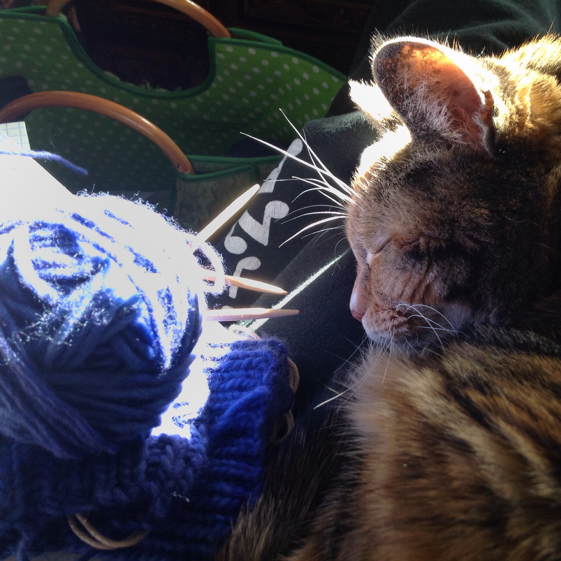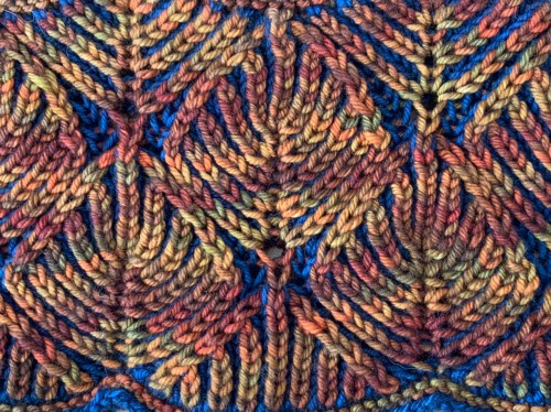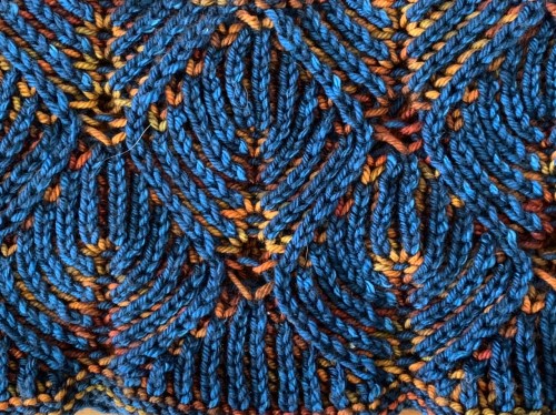 I’m knitting a smaller cowl with the colors reversed; this is the RS. The blue shows up pretty well as the main color, better than you can see in this picture.