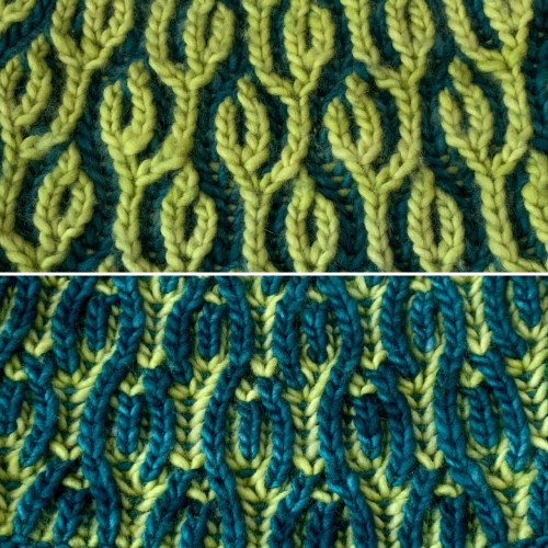 Here’s a look at the outside and inside of my Brioche Pastiche hat. Mostly, I choose the brighter color to be the patterning color on the RS of my fabric, because light colors pop against the dark so they’re easier for your eye to read the pattern. If I wanted that interesting WS pattern to be the light color on the RS, I’d knit this with colors reversed, and then turn it inside out.