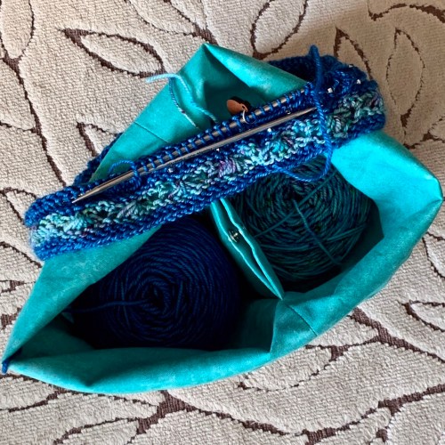 What makes a good project bag? It needs to be roomy enough to carry the yarn and the project. And I like an inner pocket to corral my essential tools. The project bag needs to fit in my tote, which also carries everything else I would otherwise carry in a handbag. I swap project bags in and out of my tote, depending on what kind of project I want with me.