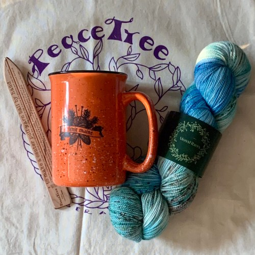 Christine is such an excellent organizer. She had Knit Maine tote bags ready for each participant, with supplies for their classes. Also in the bags? These mugs, and a center pull ball winder from Katrinkles. ETA: T-shirts, and a copy of Taproot magazine. (I had partially unpacked, and things got separated!) A skein of yarn from Moss Fibers, specially dyed as The Maine Event colorway, was the parting gift. I’m looking forward to making something special with it.