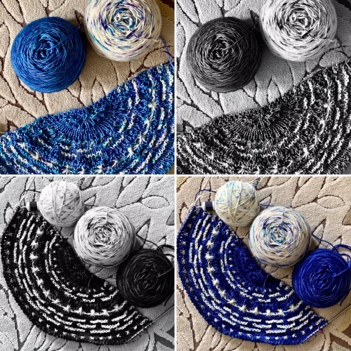 Remember this? I really liked how the smaller/whiter ball was popping against the dark blue background, but I didn’t have enough to knit a whole shawl with this leftover half ball.