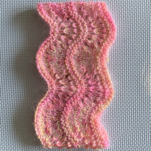 The little 50g balls go pretty quickly. The knitting looks loose and crinkly, but I have this previously blocked swatch to remind me of how swingy, smooth, and drapey it’s going to be.
