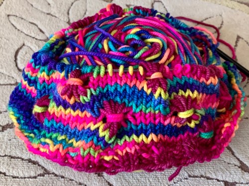 This is why I’m really enjoying the assigned pooling. It just takes an occasional glance to see when it’s time to work the pooling stitches. That’s much more relaxing for me because I don’t have to control the tension. So I’m knitting a cowl, approximately 34 inches in circumference (making a wild guess based on the piece that was previously on the US 10 needles). I’m using the sunburst stitch whenever the deep red-purple appears.