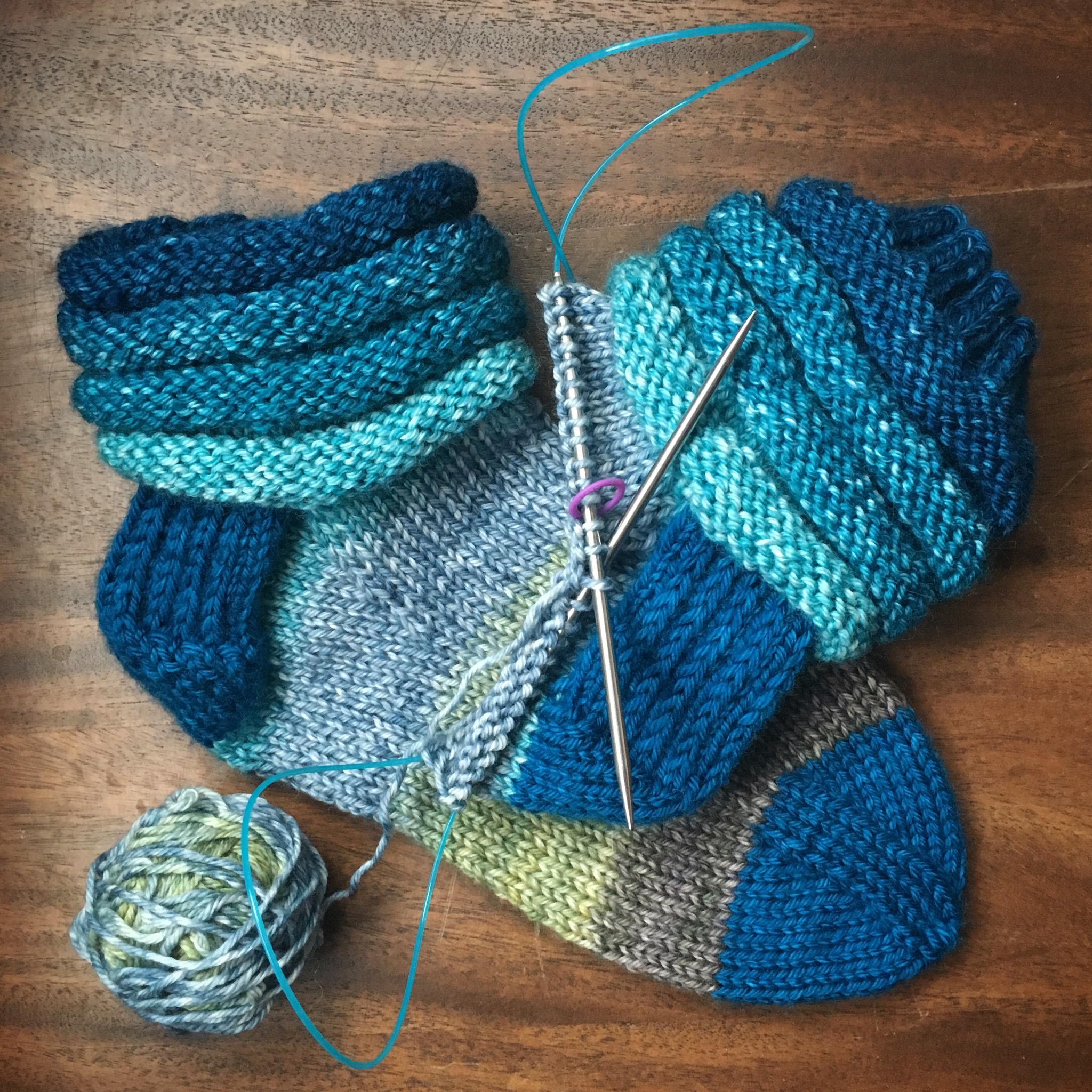My other project is a slipper sock. I’m using 4 50g balls of KnitCircus Ringmaster Panoramic Gradient (worsted weight), colorway Thanks for all the Fish, to double strand the socks. They are glorious. (Picture from KnitCircus site, since I forgot to take a picture before I started knitting.) I finished the first one at the coast. Good thing it was time to go home; I was out of knitting!
