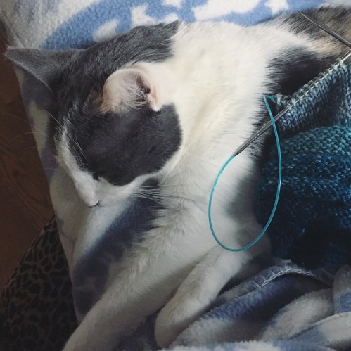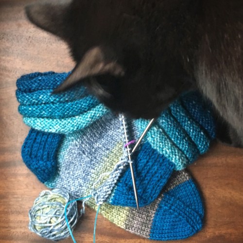 No real sneak peek on the sock yet; the excitement is on the cuff! I knit mine using the magic loop technique, and Biscuit thought that was pretty interesting when I tried it on. I’ll be looking for test knitters soon. Would you like to knit slipper socks? They’re really quick! This one took me one day.