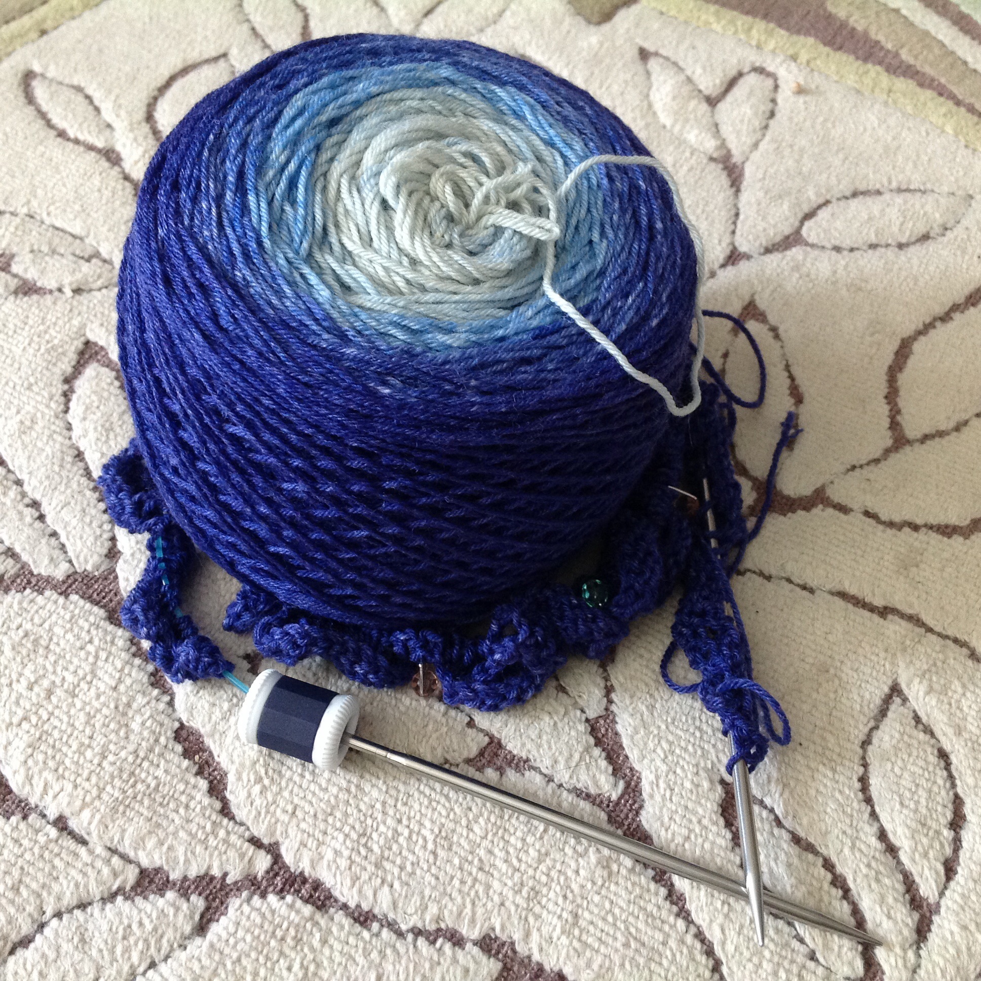 I started knitting with leftover yarn, but I really wanted something that coordinated with our bedroom, and I wanted it to be more interesting than a stockinette circle. Assigned pooling is doing the trick.