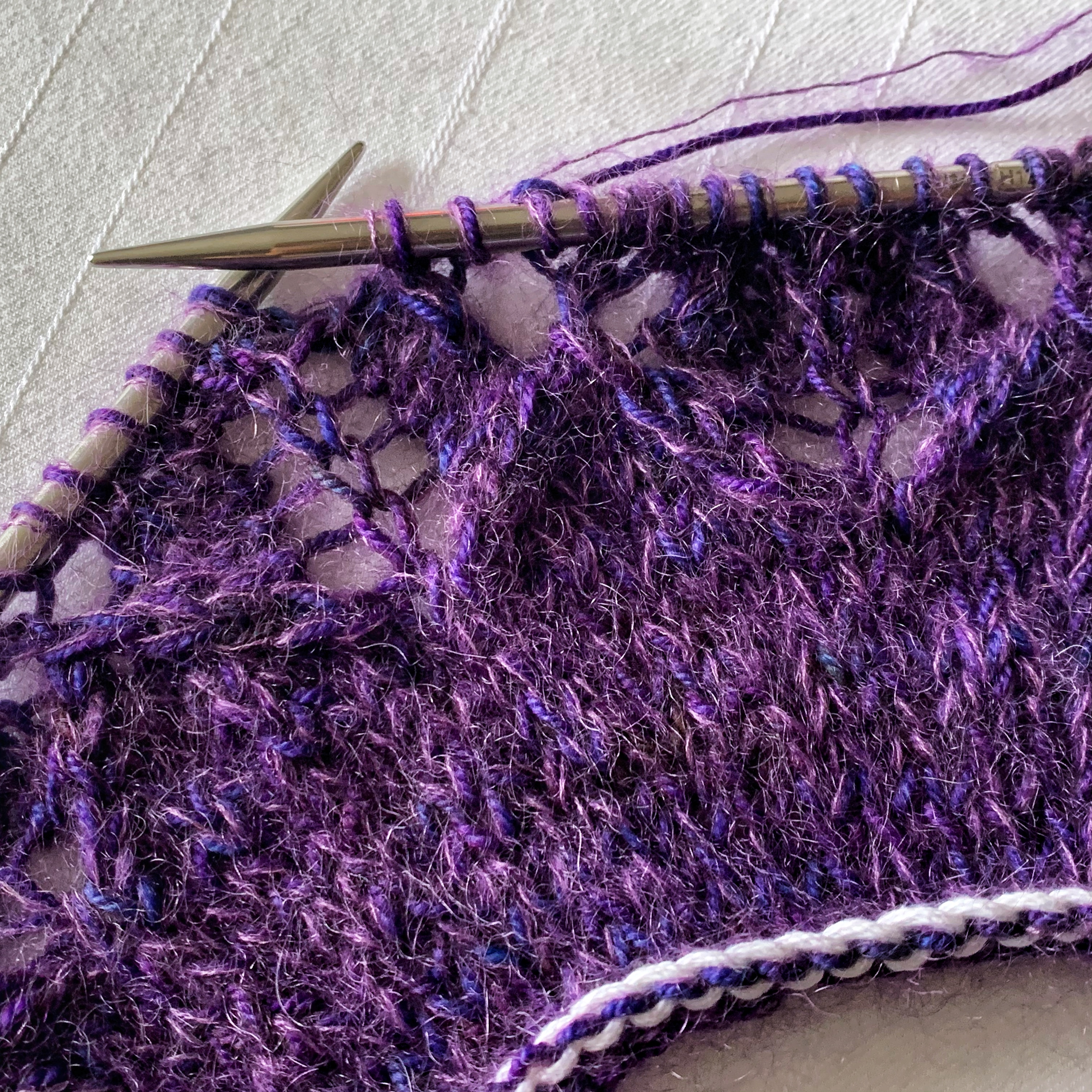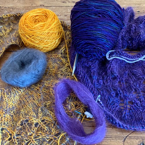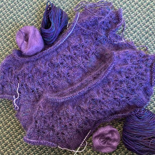 The mohair makes the lace a bit fuzzy, but it’s pretty anyway. Now I have to find something to wear it with. I’m glad I found a project for these two retreat souvenir yarns!