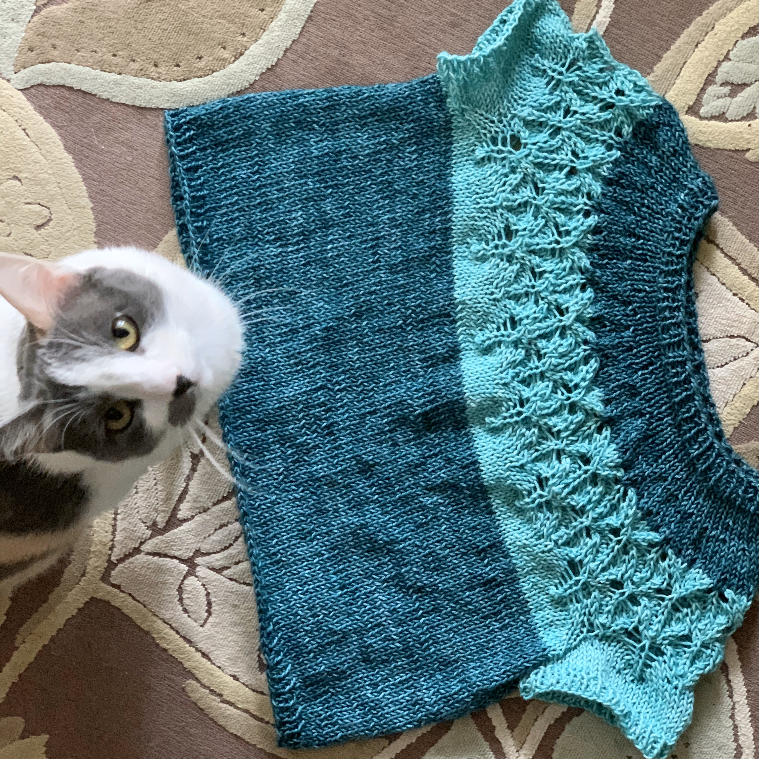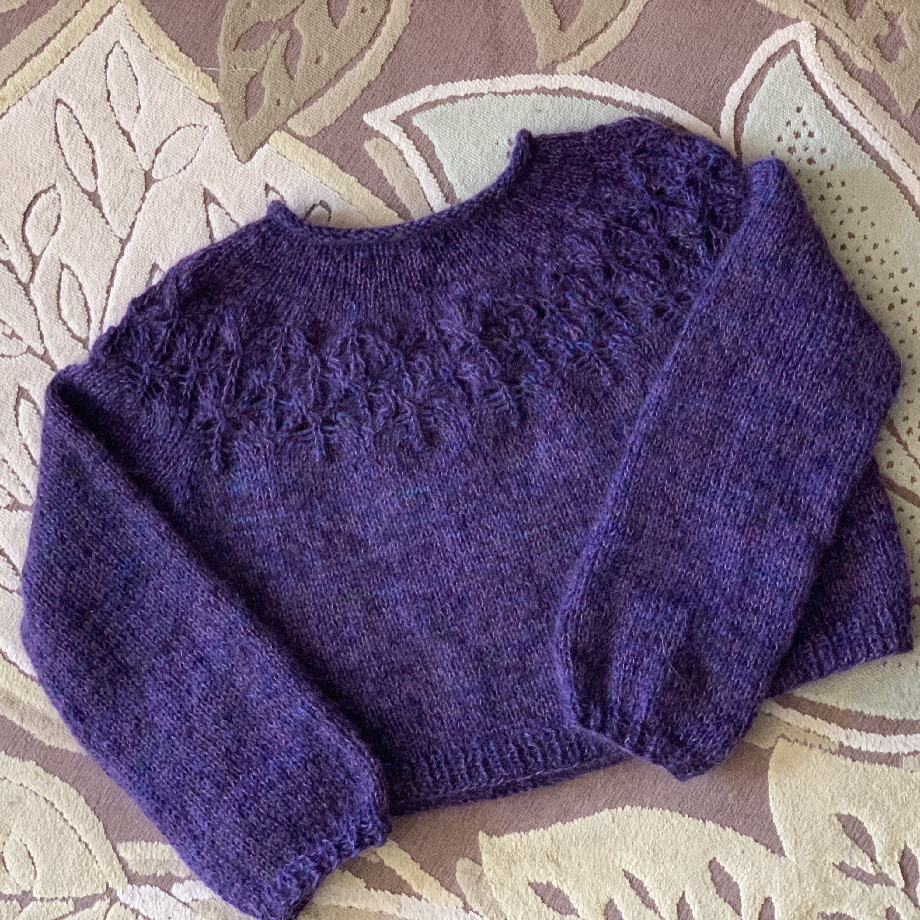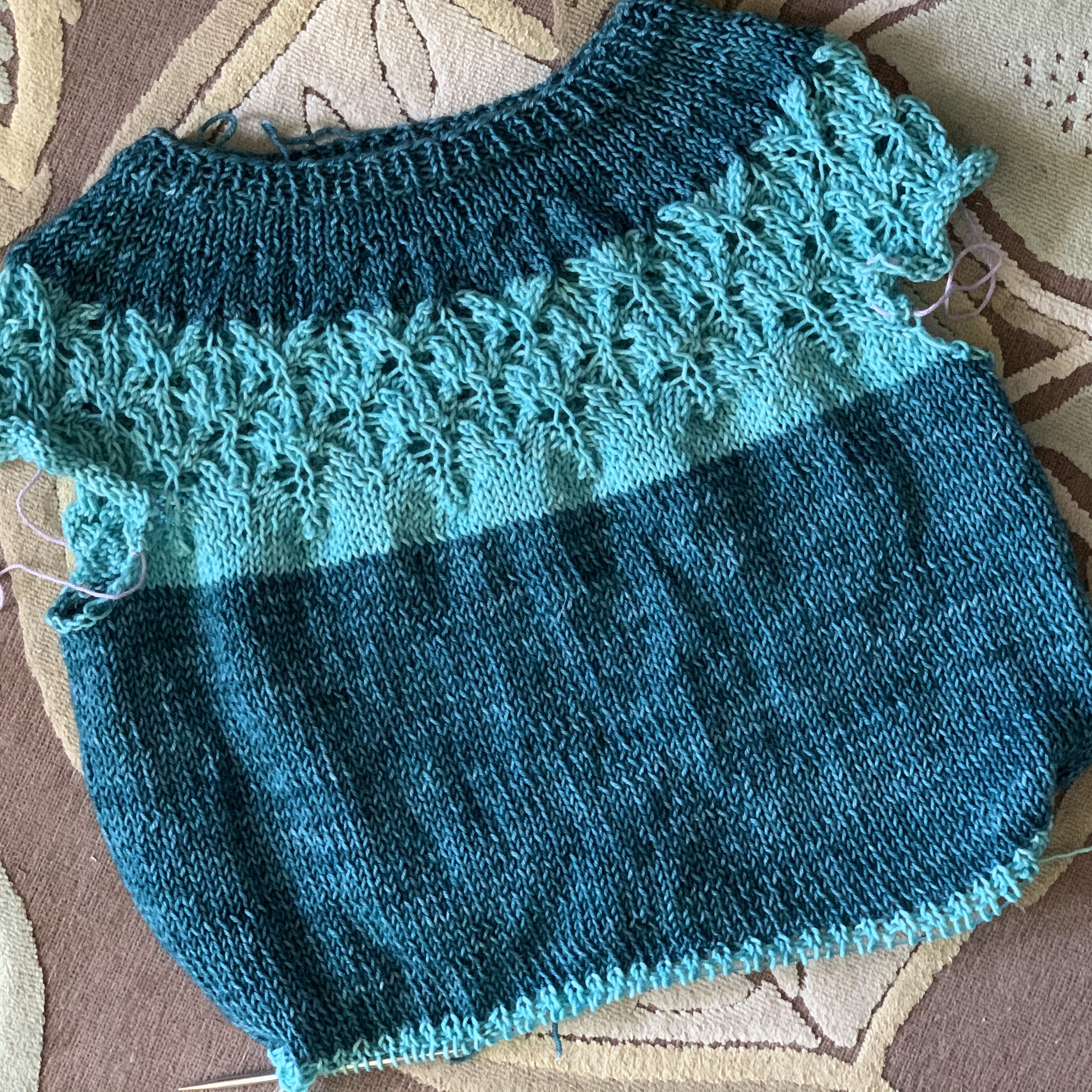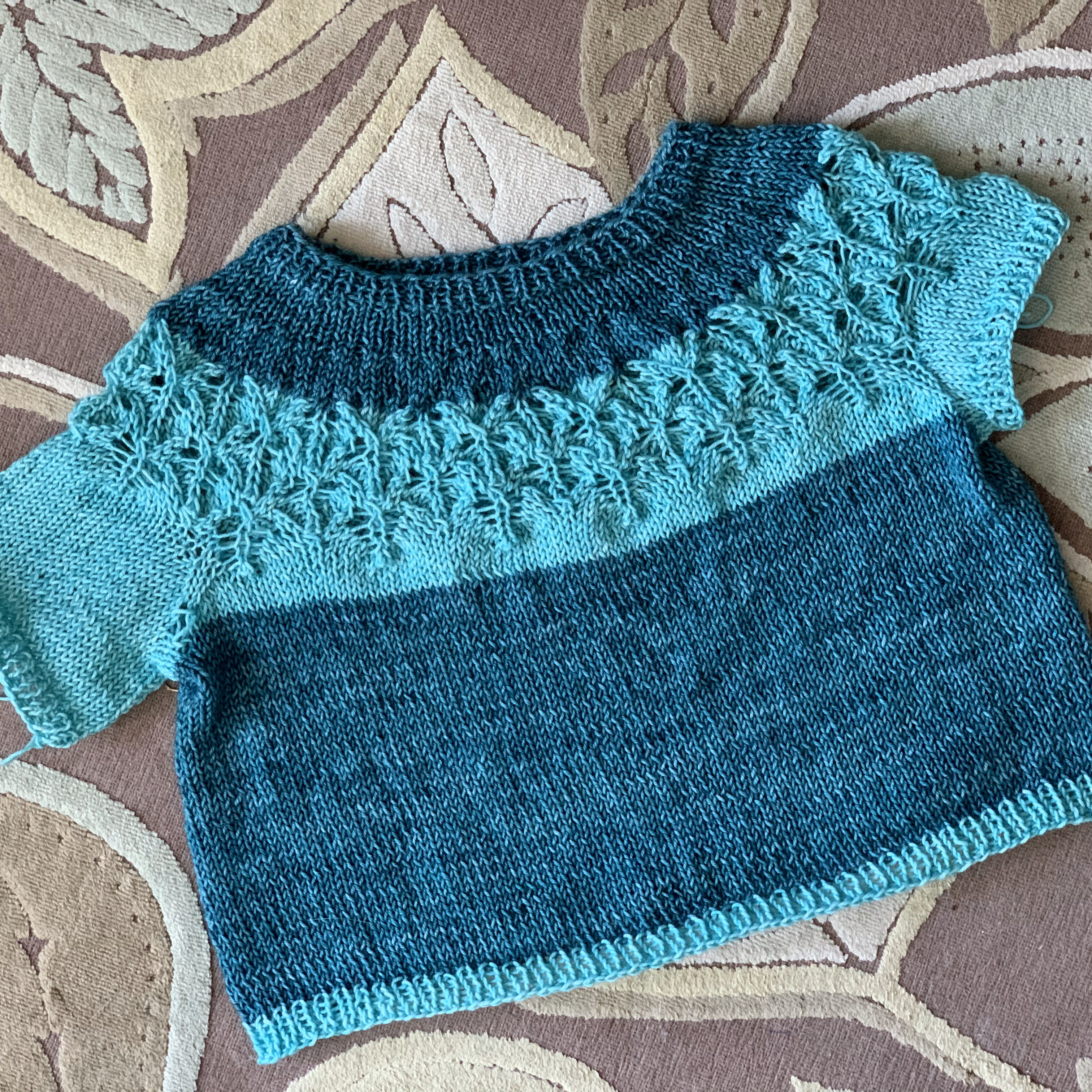 I definitely got familiar with the fabric on different sized needles! I used a US 9 for the upper body and lace, a US 10 for the stockinette body and sleeves, a US 8 for the bottom ribbing and sleeve ribbing, and a US 7 for the neck because it was above the US 9 lace. A US 8 probably would have been fine for the neck; I just didn’t think of it.
