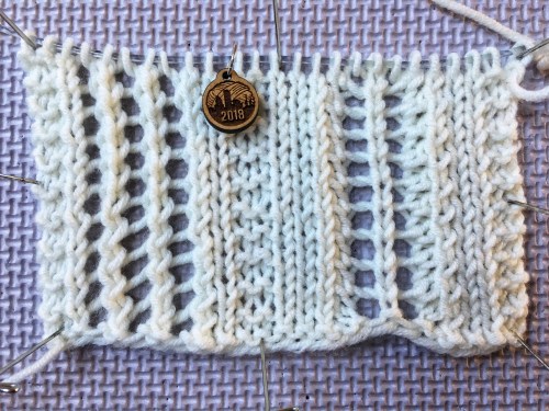 Above, my swatch from Tuck, Twist, and Roll with Candace Eisner Strick. Lots of fun bits to add to dress up your knitting. I especially liked the twisted cast on, a little different than the one I’ve used before.