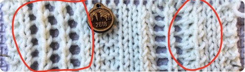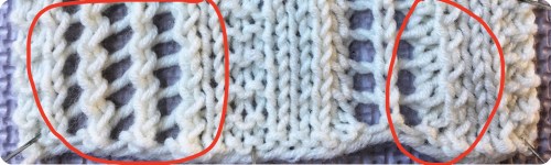 But! When I was designing my Meander Cowl, I noticed that this SSK looked wide and bumpy when it met up with a YO on its left side. It’s because the right leg of the stitch shows a bit more prominently behind the left leaning stitch on top. Subtle, yes, but there.