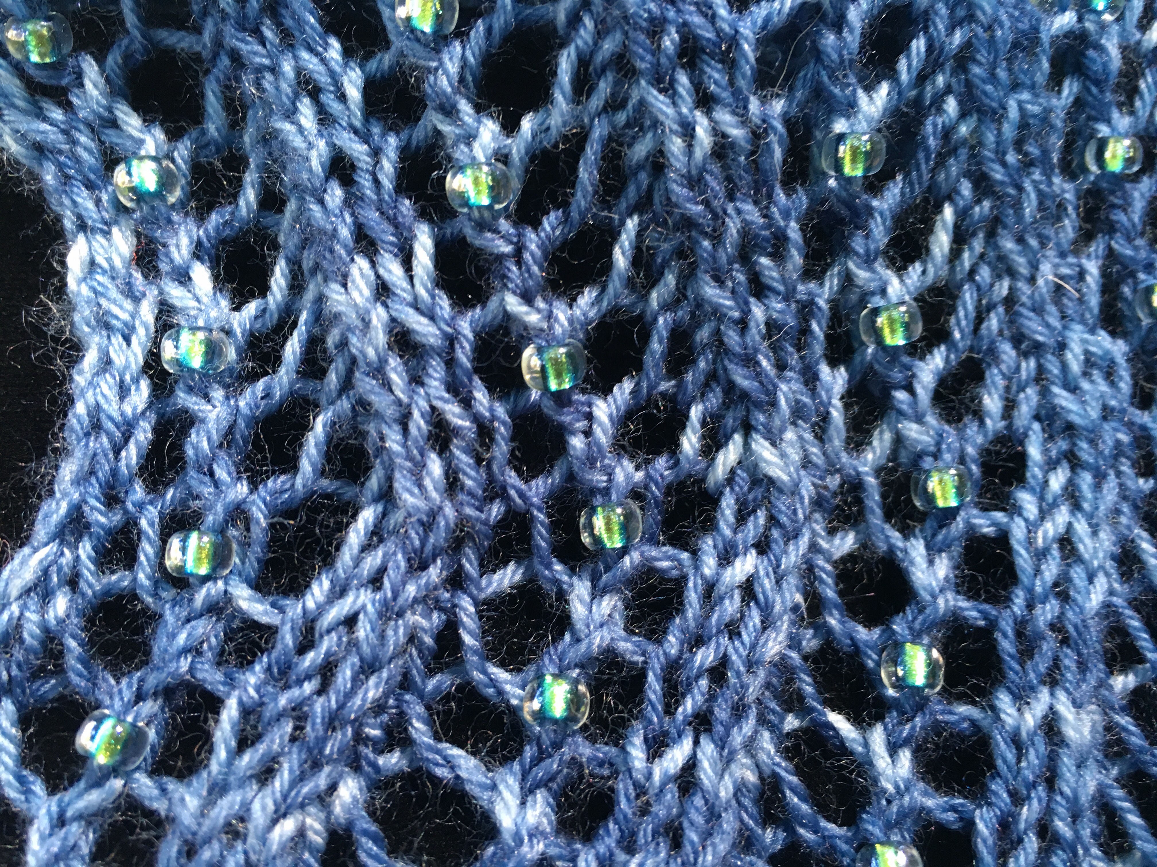 I knit this in Bumblebirch Heartwood, 75/25 superwash merino/nylon. The colors are Atlantic and Hellebore, the same colors in my Tumbling Leaves, but reversed. I love it, and I love the beads, too. Depending on how you look at them, they’re blue, or green. Perfect.