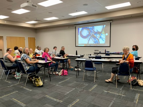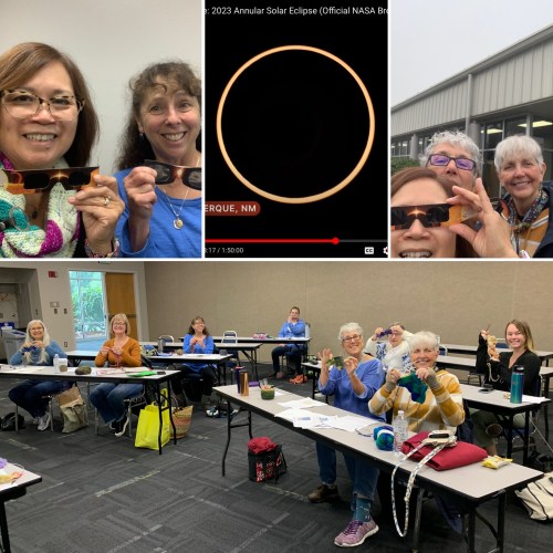 On Saturday morning, there was a complete annular eclipse (95% of the sun blocked by the moon) right after class started. Unfortunately it was foggy AND cloudy in Albany, so we just saw gray sky. Five percent of the sun’s light is still a lot of light; we didn’t really see any difference, although Karen and I were ready with our eclipse glasses. Mine were leftover from the 2017 total eclipse.
