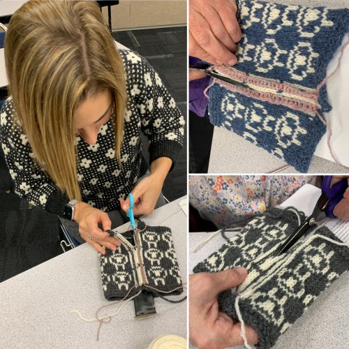 You have to make your own excitement, and we did that in the morning by reinforcing and cutting steeks, eek! (And I see that my students are suggestible, using the same colors I did in the Sheepy Steeky Coasters pattern!)