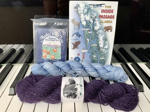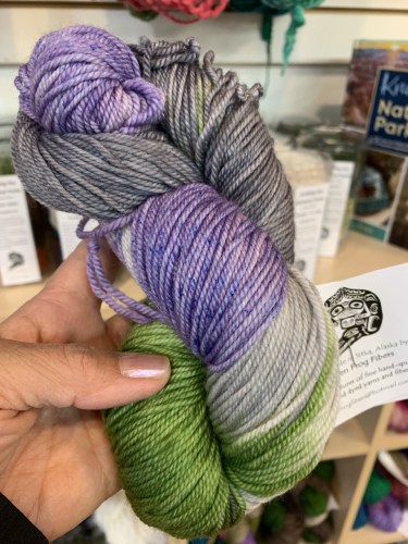 Our first stop was in Juneau. I made a quick scouting trip as DH waited for me in a coffee shop before our tour to Mendenhall Glacier. Changing Tides (Instagram link, formerly Seaside Yarns) is right in the port area. They have yarn and lots of fabric for quilters, too. Local dyers Juneau Woolies and Alaskan Yarn Co. are featured here.