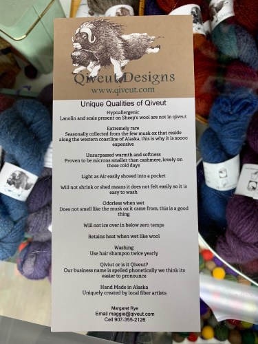 In Sitka I stopped at the Raven’s Hook, a small arts and crafts store with yarn and other craft supplies. No qiviut here.