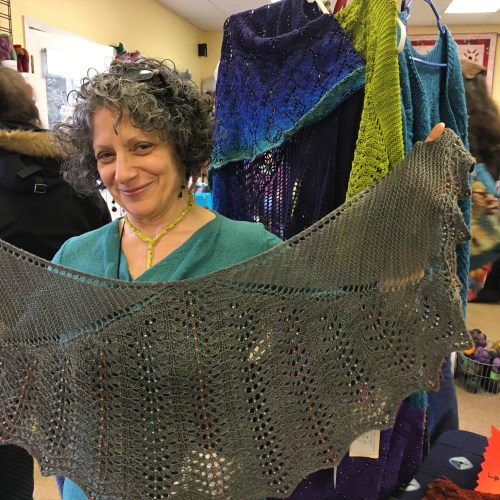 Finished size: 60” x 30” pinned out, and it bounced back to 60” x 28” deep when I took it off the wires. It is larger partly from the added knitting, and partly because the first time I blocked it, I did it outdoors on a hot September day, and it was drying very quickly while I was pinning. Now we’re in winter, and I blocked it in my studio. It is the loveliest, airiest thing. Yay!