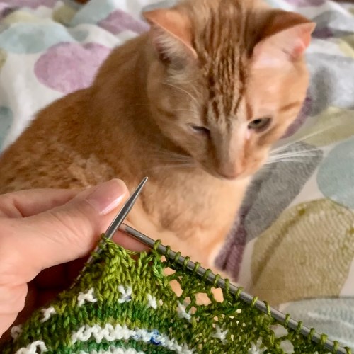 I knit this last year for my KAL, and stopped short of the acid green at the end because I had already added 24 rows to the original pattern. Last weekend I decided to take the edging off and use more of the gradient, so I did! I ripped back all the way through the flying arrows, so I could add a third repeat of that last section of star trails. I then replaced the flying arrows, and finished again. I had 1.3 g of gradient left, yay for yarn scale and not yarn chicken!